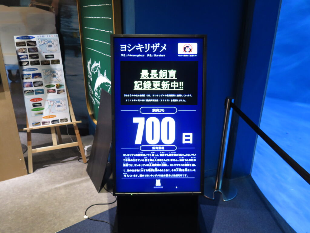 仙台うみの杜水族館はヨシキリザメの長期飼育記録を更新中とのことで、撮影時点で700日を超えていました。